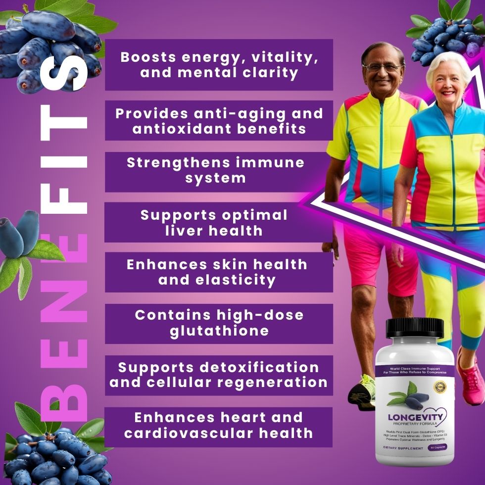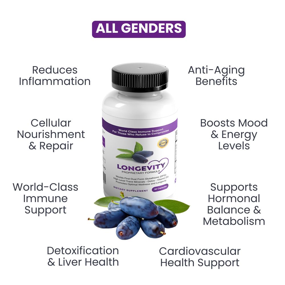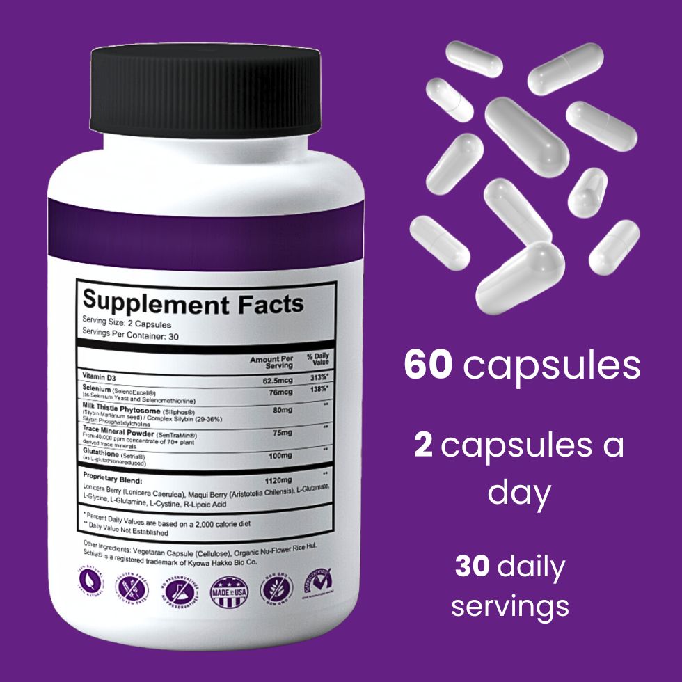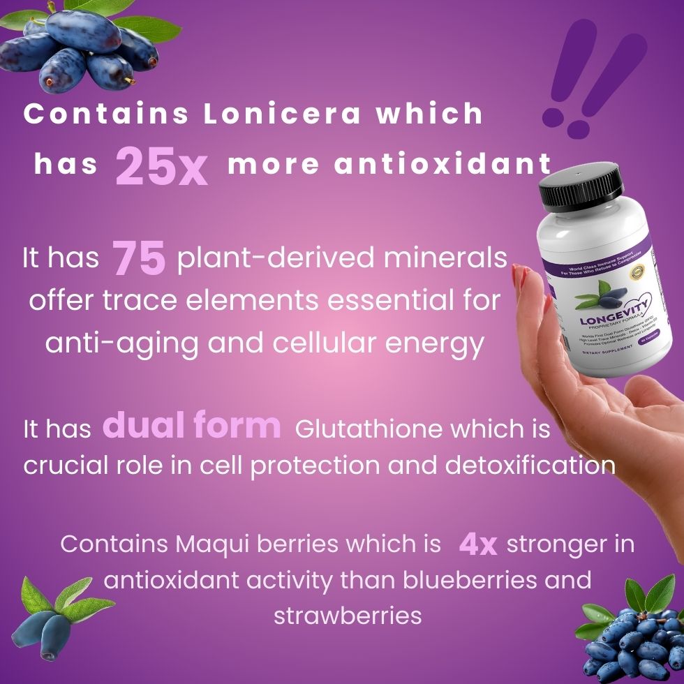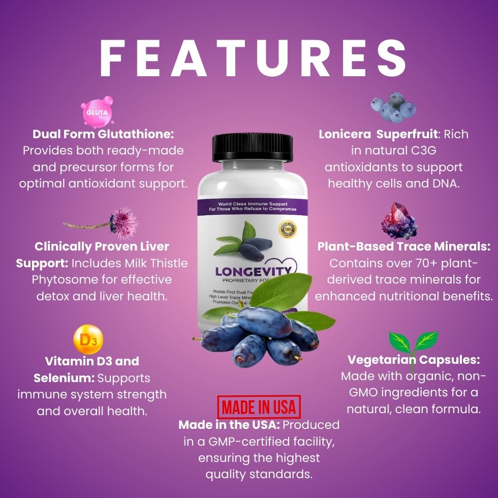 It combines dual-form glutathione with Lonicera Caerulea, plant-based minerals, and therapeutic dosages of key nutrients for unparalleled immune, detox, and anti-aging benefits.